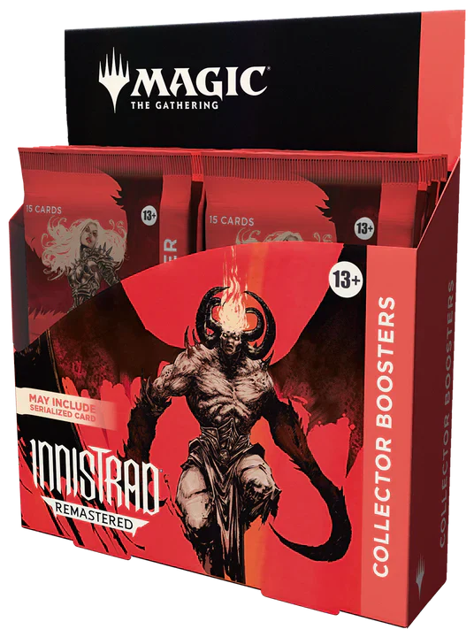 Uncover Innistrad’s devilish threats and blessed relics sealed within this vault! Each bone-chilling Collector Booster guarantees Rares and/or Mythics, Traditional Foils, and a Retro-frame card infused with old-school Magic charm. You may even encounter stylish Movie Poster cards or live in eternal infamy with a one-of-a-kind serialized Edgar Markov!
